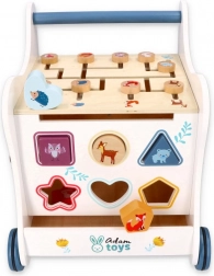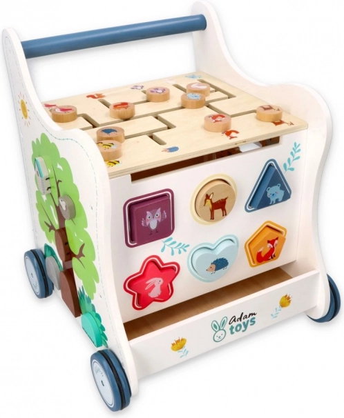 Deze houten duwloopwagen voert je kind mee in de wereld van kleuren, vormen en bosdieren. Het voorpaneel biedt een leuke vormenstoof die de fijne motoriek, oog-handcoördinatie en het logisch denken stimuleert. Bovenop wacht een doolhof met schuifkralen dat geduld, planning en ruimtelijk inzicht bevordert. Zijdelingse illustraties met dieren inspireren tot het ontdekken van de natuur en het verzinnen van eigen verhaaltjes.