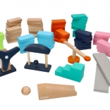 - 120 houten blokjes in 6 kleuren, 3 mechanische elementen (bijv. draaimolen, windmolentje, poort met knikker), 2 brugplaten, 3-traps trapje, startglijbaan met knikker