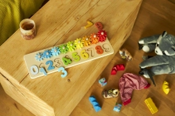 Dit houten sorteerspel van GOKI biedt kinderen een speelse manier van leren. Elk cijfer 0–9 heeft zijn eigen pinnetje en een bijpassend gekleurd tandwiel. Kinderen kunnen eerst op kleur koppelen en geleidelijk overstappen naar het herkennen van cijfers en tellen. Door één wieltje te draaien gaan de andere mee, wat logisch denken en het begrijpen van verbanden stimuleert.