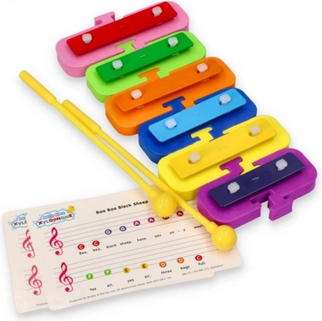Zeven duidelijk gekleurde latjes helpen kinderen snel ritme, kleuren en eenvoudige melodieën onder de knie te krijgen.