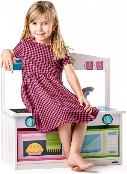 Deze multifunctionele houten 2-in-1 keuken en bank biedt kinderen uren speelplezier en praktisch gebruik in één. De keuken is uitgerust met een kookplaat met draaiknoppen, een gootsteen met kraan en opbergvakken die doen denken aan een oven en magnetron. Dankzij de stabiele constructie is hij geschikt voor dagelijks spelen én zitten.