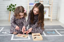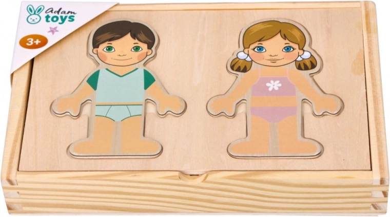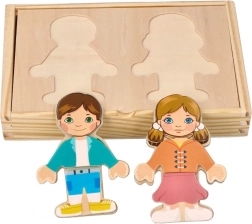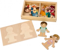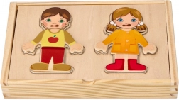 Deze houten magnetische puzzel met figuurtjes van een jongen en een meisje biedt tientallen mogelijkheden om ze aan te kleden en de onderdelen te combineren. Tijdens het spel trainen kinderen de oog-handcoördinatie, het logisch denken en het waarnemen van vormen en kleuren.