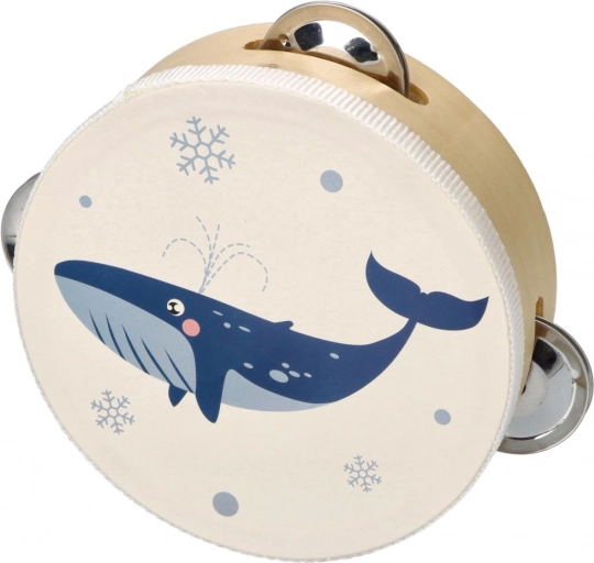 Deze kindertambourijn met vrolijk walvismotief is een uitstekend instrument voor de eerste ritmische experimenten. De houten body, het gespannen vel en de metalen belletjes creëren een prettig geluid dat kinderen motiveert om te spelen en muziek te ontdekken.