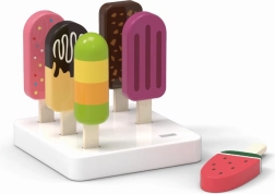 Houten ijsset voor kinderen bevordert creatief en nabootsend spel. De set bevat 6 gekleurde ijsjes en een standaard voor stijlvolle opslag.