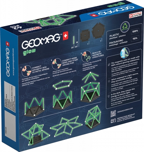 Ontdek de magie van de magnetische bouwset GEOMAG Glow met 42 delen, die in het donker oplichten. Laad op met licht, doe het licht uit en kijk hoe je creaties stralen! De set stimuleert creativiteit, fijne motoriek en ruimtelijk inzicht en is vervaardigd met Zwitserse precisie en focus op veiligheid.