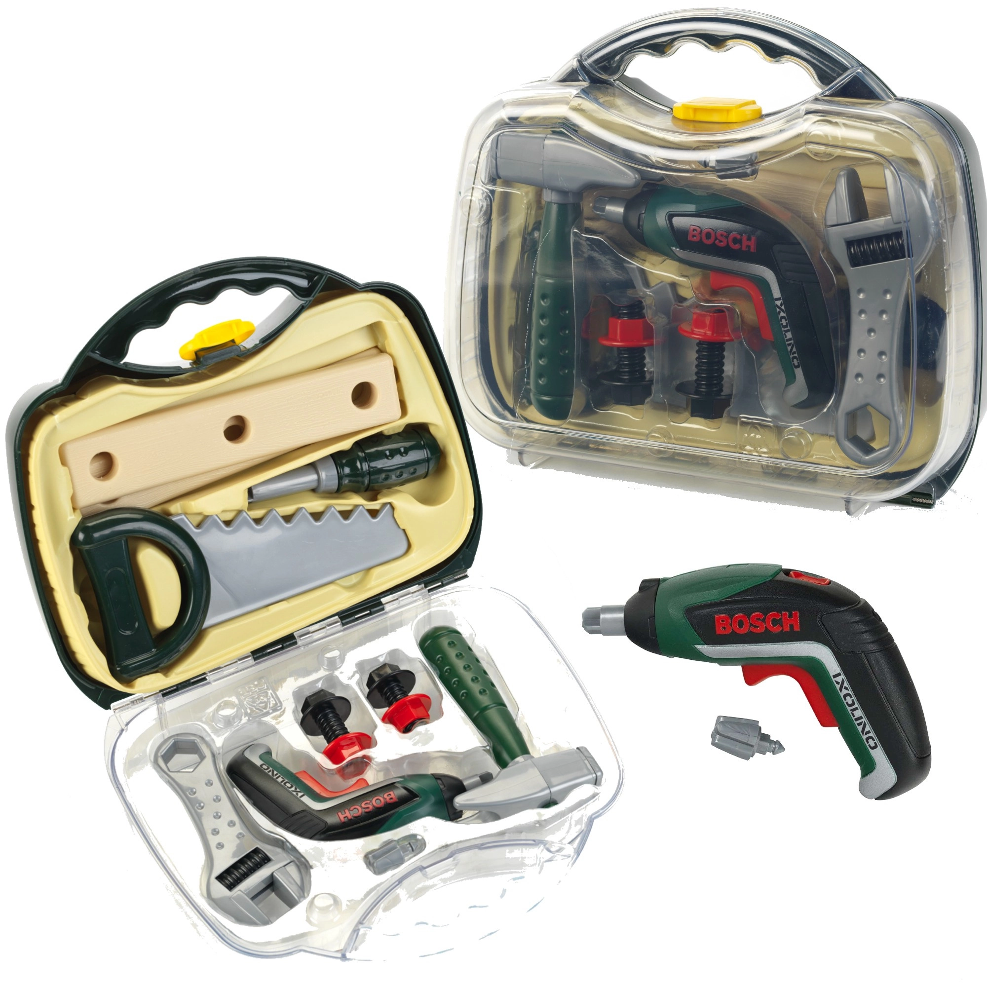 Kinderkoffer met gereedschap uit de gelicentieerde lijn BOSCH Mini van het merk KLEIN biedt realistisch rollenspel als reparateur. Binnenin vind je een op batterijen werkende accuschroevendraaier Ixolino II met rechts-/linksom draaien en motorgeluid, aangevuld met andere duurzame tools. De stevige donkergroene koffer met transparante deksel en twee rode sluitingen houdt alles veilig bij elkaar en is ideaal voor kleine klussers vanaf 3 jaar.