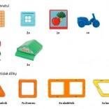 7 vierkanten, 4 driehoeken, 2 rechthoeken, 1 ruit, 7 plastic accessoires, 1 figuurtje