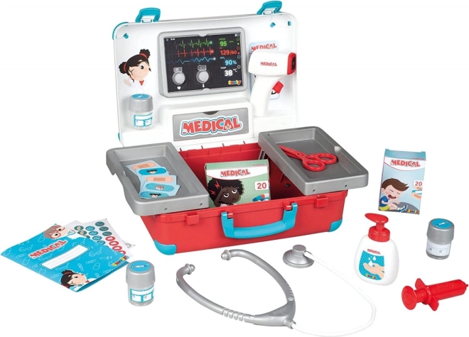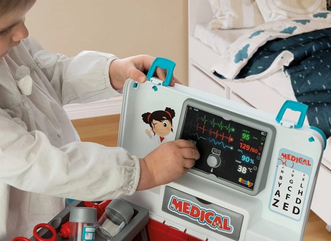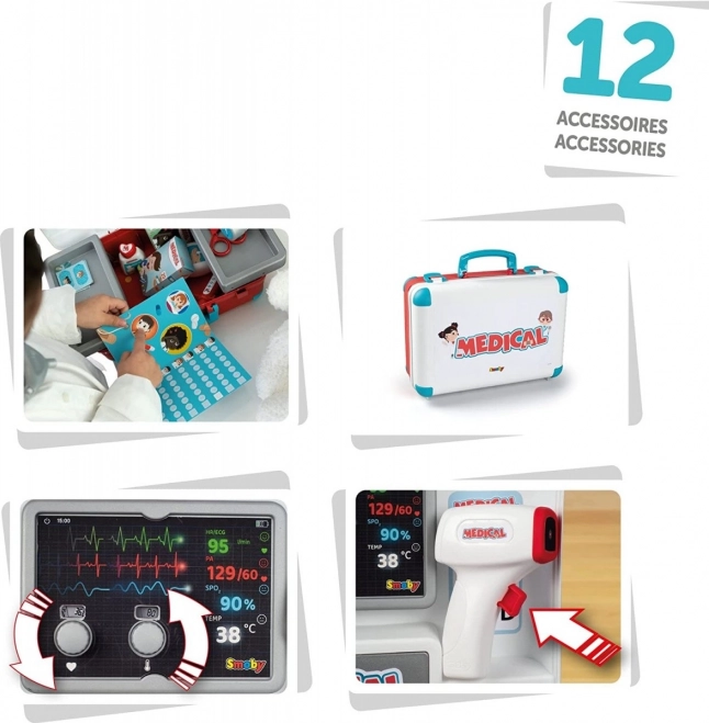 Doktersset Smoby voor kinderen met 12 onderdelen, inclusief een mechanische thermometer en stethoscoop, stelt kinderen in staat om spelenderwijs de wereld van de geneeskunde te verkennen. Het bevordert fantasierijk spel en introduceert kinderen in de medische praktijk.
