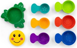 Stapelspeelgoed voor in bad Flower van Milly Mally. 6 kleurrijke bekers om te stapelen, een toren te bouwen of te gebruiken als zandvormpjes. Elke beker heeft gaatjes in de bodem, zodat je er water mee kunt gieten en zand kunt zeven om mee te spelen, op de speelplaats of op het strand. De kleuren en reliëfpatronen op de bekers helpen bij het leren.