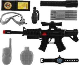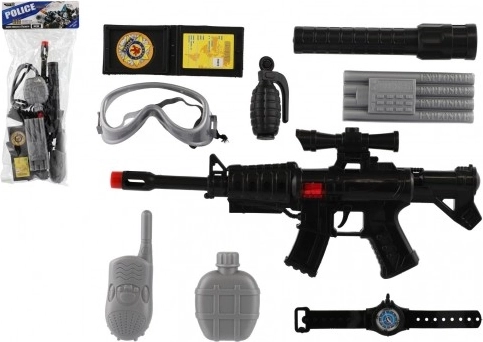 Dit plastic politie speelgoedmachinegeweer van 38 cm is het ideale cadeau voor elke jonge liefhebber van politie-rolspellen. De set bevat een machinegeweer, granaat, vizier, horloge en andere belangrijke accessoires die urenlang speelplezier zullen bieden aan kinderen.
