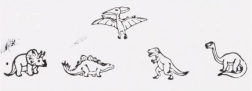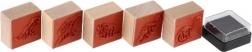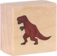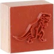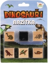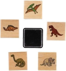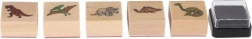 Vijf houten stempels met dinosaurusmotieven en een inktkussen in de verpakking – gewoon openen en stempelen.