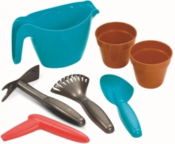 De set bevat compleet gereedschap: een gieter om water te geven, twee bloempotjes voor de eerste aanplant, een schep, hark, spade en plantstok. Zo oefenen kinderen hun fijne motoriek, samenwerking en band met de natuur.
