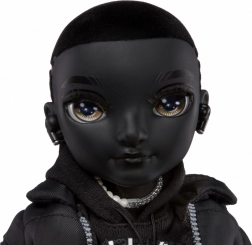 De pop draagt een stijlvolle zwarte outfit met een moderne en stedelijke uitstraling, inclusief een lange zwarte jas en accessoires.