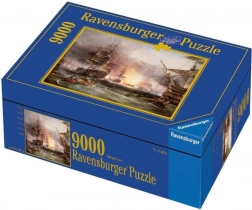 De dramatische scène met zeilschepen in gevecht, rook en explosies geeft het voltooide beeld een indrukwekkende sfeer en decoratieve waarde.