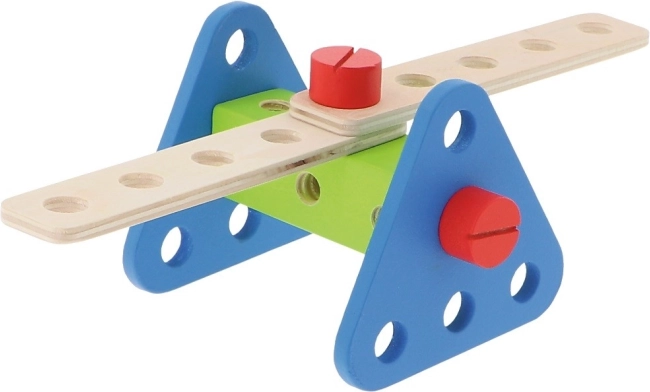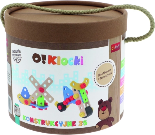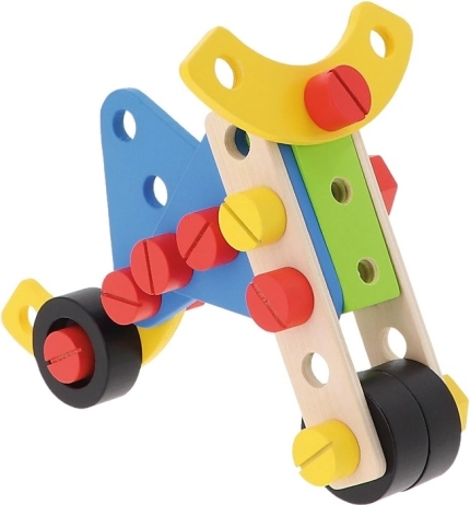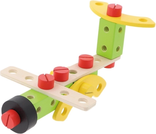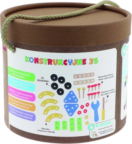 De set bevat 35 onderdelen: blokken, schroeven, gereedschap en een handleiding met voorstellen voor het bouwen van uiteenlopende constructies.