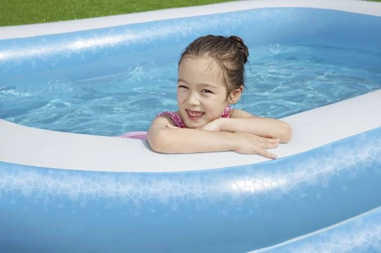 SPECIFICATIES- Bestway productcode: 54006; materiaal: vinyl; uitvoering: 2 gelijke ringen / brede zijwanden / aftapventiel voor het legen; leeftijd: vanaf 6 jaar; capaciteit: 778 liter; afmetingen (lengte / breedte / hoogte): 262x175x51cm; gewicht: 4,5 kg