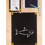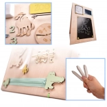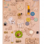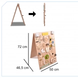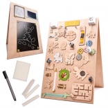 Een unieke functie van dit bord is de dubbelzijdigheid - één zijde bevat talrijke manipulatieve elementen en de andere dient als een oppervlak om te tekenen en te schrijven met krijt, stiften of potloden. Dit helpt kinderen hun creativiteit en fijne motoriek te ontwikkelen.