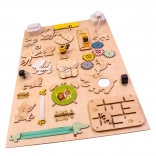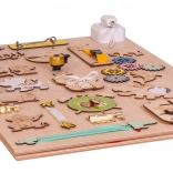 Het bord bevat kleurrijke tandwielen, belletjes, sloten en andere interactieve elementen die de fijne motoriek bevorderen.