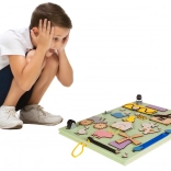 Dankzij verschillende beweegbare onderdelen en oppervlakken stimuleert dit bord de fijne motoriek en biedt het zintuiglijke prikkels voor ontwikkeling.