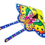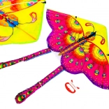 Kleurige vlindervlieger met een breedte van 90 cm van duurzaam nylon, voor gemakkelijk vliegen zelfs bij zwakke wind. Inclusief een stevige nylon lijn met handvat, lichte constructie en aantrekkelijk design voor plezier voor het hele gezin.