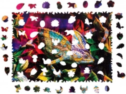 Deze design houten puzzel van hard beukenhout neemt je mee in de wereld van een kleurrijke kameleon en tropische bladeren. Dankzij de speciaal gevormde stukjes, waarvan vele de vorm van dieren en planten hebben, is het leggen leuk, creatief en tegelijk iets uitdagender dan bij klassieke puzzels.