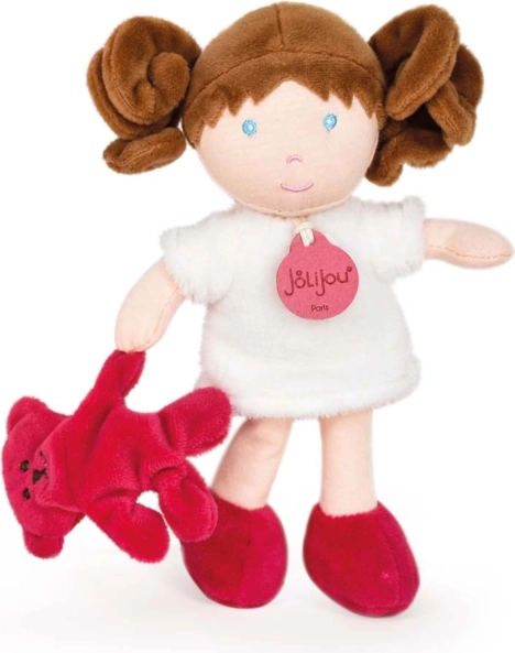 Deze pop is ontworpen om plezier te brengen en voldoet tegelijkertijd aan de CE-veiligheidsnormen, ideaal voor kinderen vanaf de geboorte. Geborduurde ogen, neus en mond geven de pop een uniek uiterlijk, terwijl haar kastanjebruine krullen naar wens gestyled kunnen worden.