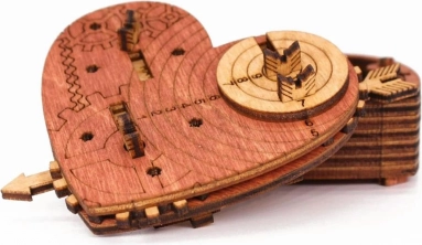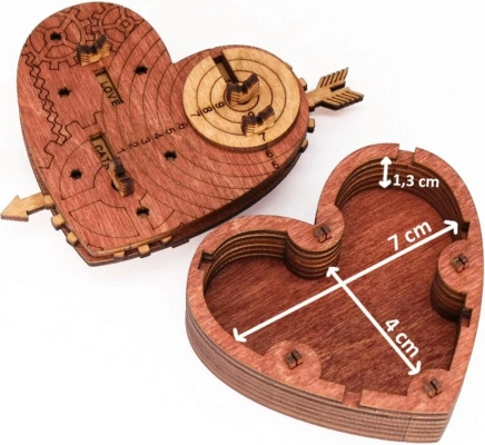 Dit stijlvolle hart met tandwielen en gravures verbergt een slim codemechanisme. Na het instellen van de juiste drie woorden trek je aan de pijl en gaat het deksel open. Je kunt het hart gebruiken als veilige verpakking voor een kleinigheid, een persoonlijk bericht of als designpuzzel om neer te zetten.