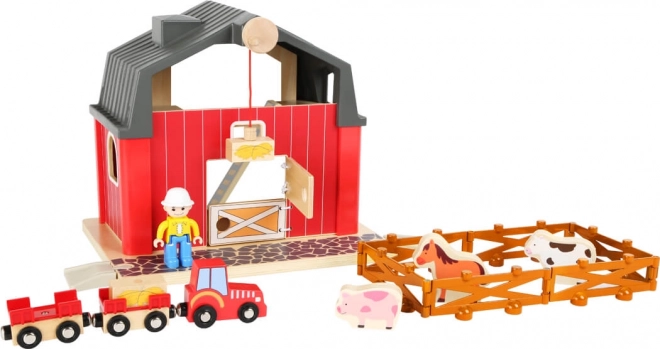 - Schuur met kraan en dubbele deuren, tractor met aanhanger, hooibalen (magnetisch), paard, koe, biggetje, 6× deel afrastering