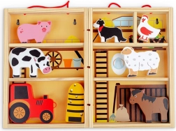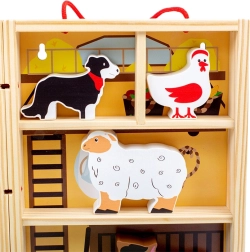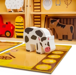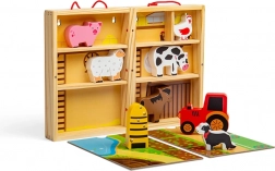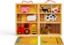 Inclusief dieren (paard, koe, hond, varken, schaap), bijenkorf en tractor. Opvallende kleuren en veilige afwerking van massief hout.