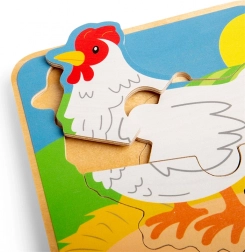 Deze compacte houten puzzel met kipthema leidt kinderen door vier ontwikkelingsfasen – van ei via kuiken tot volwassenheid. De onderdelen worden geleidelijk op grootte gelegd, wat het begrip van volgorde bevordert en op natuurlijke wijze geduld en concentratie traint.