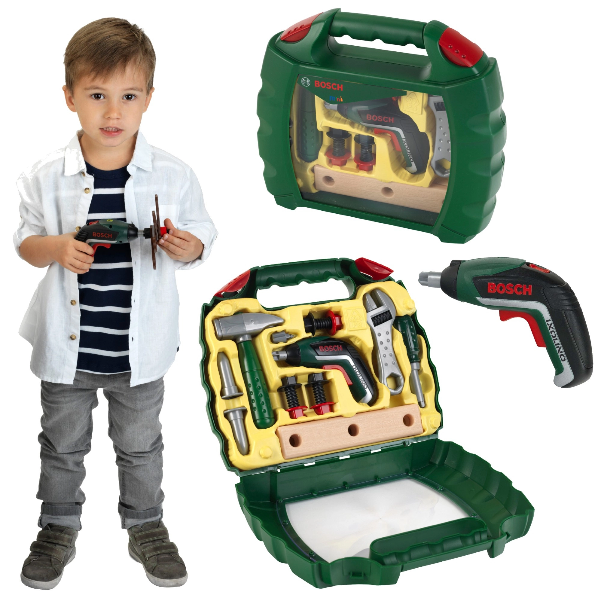 Praktische kinderkoffer met gereedschap uit de gelicentieerde BOSCH Mini-lijn van het merk Klein die elke kleine klusser zal verrassen. Bevat een functionele speelgoed accu-schroevendraaier Ixolino II met verwisselbare bits, rechts-/linksom en motorgeluid, aangevuld met een hamer, schroevendraaier, steeksleutel, schroeven, moeren en “houten” onderdelen. De stevige donkergroene koffer met transparante voorkant en dubbel rood slot houdt alles veilig bij elkaar.