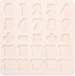 De houten WOODY-inlegpuzzel laat kinderen kennismaken met de cijfers 0–9 en basisrekenkundige tekens. Dankzij de uitvoering zonder knopjes trainen kinderen de vingerprecisie en de oog-handcoördinatie en leren zij spelenderwijs de basis van het rekenen.