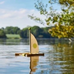 De lichte houten romp en eenvoudige zeil stimuleren fantasierijk spel en veilige wateravonturen.