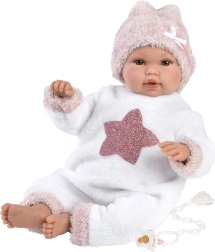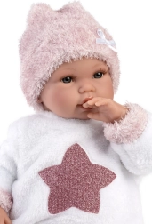 Dankzij de met scharnieren bevestigde armpjes en beentjes is de pop verstelbaar en kan ze stabiel zitten. Een decoratieve speen en batterijen zijn inbegrepen voor direct speelplezier. Voor de pop zijn eenvoudig originele LLORÉNS kleertjes in maat 35–36 cm bij te kopen.