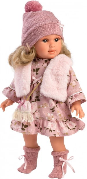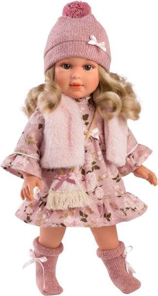 De set bevat ook een stijlvolle hoed met pompon, een sjaal en een kleine tas die de outfit compleet maken.