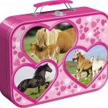 Stevige metalen verpakking met paardenontwerp, ideaal voor het opbergen en meenemen van de puzzels.